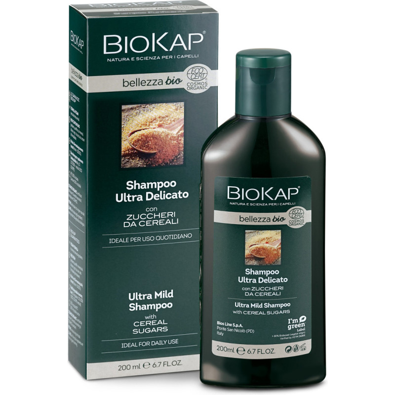 Lo Shampoo Ultra Delicato Biokap Bellezza bio è ideale per lavaggi frequenti e uso quotidiano. La sua formula, certificata biologica Cosmos Organic,contiene zuccheri da Cereali che detergono delicatamente e mantengono i capelli idratati, soffici e docili al pettine. Grazie al fito-complesso da noci verdi protegge i capelli dagli agenti esterni e ne preserva il colore. Infine, la presenza di estratto di Mandorle, assicura morbidezza e lucentezza ai capelli.