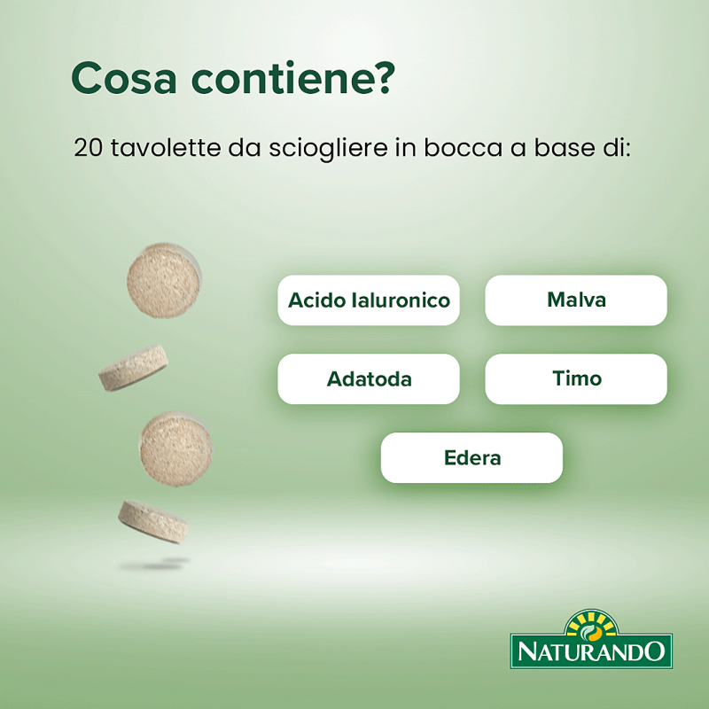 Fructose, Maltodextrin, Adatoda leaf dry extract (Justicia adhatoda L.) tit. 0.5% alkaloids, Ivy leaf dry extract (Hedera helix L.) tit. 1% in hederagenin, Mallow leaf dry extract (Malva sylvestris L.) tit. 25% in polysaccharides, Thyme leaf dry extract (Thymus vulgaris L.), High molecular weight Sodium Hyaluronate, Anti-caking agents: Magnesium salts of fatty acids, Silicon dioxide; Flavoring, Sweetener: Sucralose; Thyme essential oil (Thymus vulgaris L.).