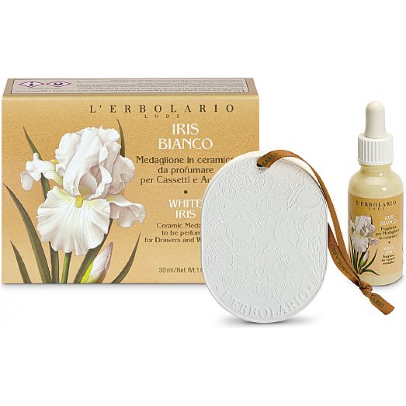 Basta dosare qualche goccia di fragranza sul medaglione in ceramica per profumare cassetti o armadi con le note pure e fresche di Iris Bianco.