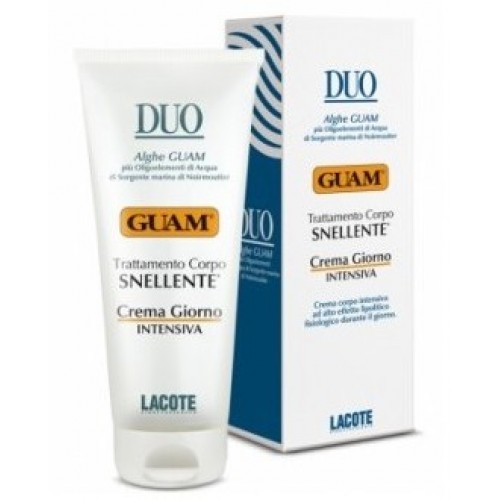 DUO GUAM Trattamento Corpo SNELLENTE Crema Giorno Intensiva, con i suoi principi attivi snellenti e rimodellanti,in particolare Alghe GUAM (Alga bruna Phyllacantha fibrosa) e Acqua di Sorgente marina di Noirmoutier, coadiuvando l’alto effetto lipolitico fisiologico durante il giorno, agisce in modo mirato sulle adiposità localizzate.