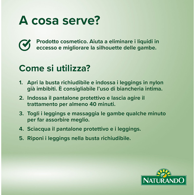 Prodotto cosmetico. Grazie alle sue caratteristiche osmotiche aiuta a eliminare i liquidi in eccesso e migliorare la silhouette delle gambe.