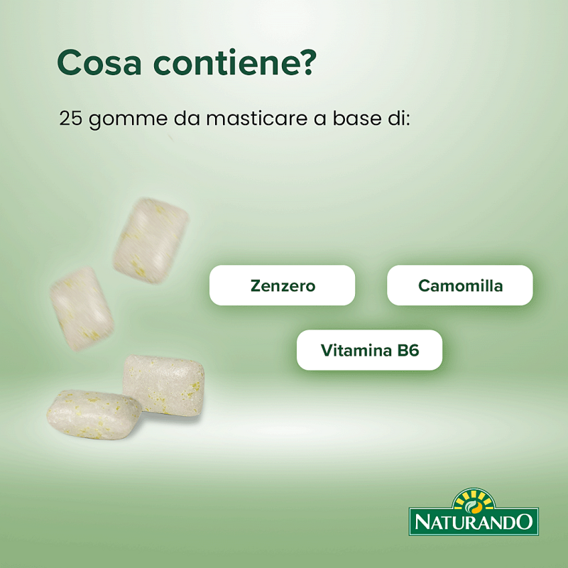 Edulcoranti: Sorbitolo, Isomalto, Sciroppo di maltitolo, Sucralosio, Acesulfame k; Gomma base, Aromi, Camomilla fiori estratto secco (Matricaria chamomilla L.) 200 mg tit. 0,3% in apigenina 0,6 mg, Zenzero rizoma estratto secco (Zingiber officinalis Rosc.) 120 mg tit. 5% in gingeroli 6 mg, Acidificante: Acido citrico; Addensante: Gomma arabica; Stabilizzante: Glicerolo; Vitamina B6 (Piridossina cloridrato) 10 mg 714%VNR, Agente di rivestimento: Cera carnauba; Zenzero olio essenziale (Zingiber officinalis Rosc.) 4 mg, Antiossidante: Estratto ricco di tocoferolo. Può contenere tracce di soia.